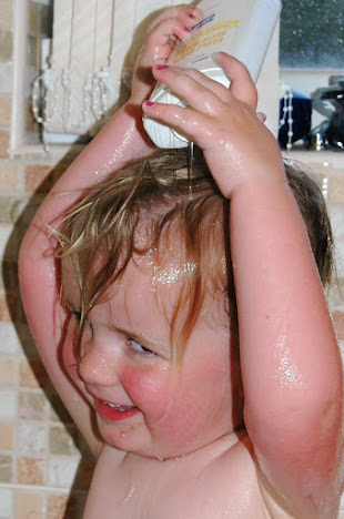 I think this is quite a cute photo of Anna trying to rinse the shampoo from her own hair... though for some strange reason it brings back vague memories of Jack Nicholson in the Shining!